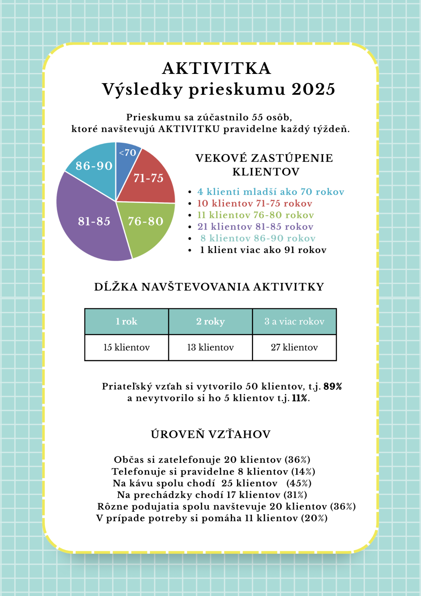 M I L Á A K T I V I T K A ! Chcem sa touto cestou podeliť s čitateľmi o svoje skúsenosti s Tebou. Milé dámy, milé seniorky ! Veľa z nás odpovedá na otázku o trávení voľného času na dôchodku na dôchodku slovami : " JOJ, neviem, čo skôr. Pomáham mladým, starám sa o vnúčence ....". Alebo : " Nikam nechodím, som doma sama.....". Ruku na srdce. Koľko z nás odpovie, že hodinu-dve sa venuje sebe, chce, aby duševne, ale aj fyzicky bola svieža a mala sama zo seba dobrý pocit? Neviete ako a kde sa to dá ? Je viacero možností, ale ja si dovolím Vám doporučiť navštíviť Občianske združenie AKTIVITKA v Ružinove . Do Aktivitky chodím už vyše troch rokov a som veľmi rada, že som sa do nej prihlásila. Krátka fyzická rozcvička rozhýbe naše ruky, loptičky zase podporia sústredenosť a obratnosť. Slovné cvičenia nám dokážu, že hoci pri zadaní sme neverili, že to dáme, zamyslením sa a koncentráciou si spomenieme na veľa možností. A keď dostaneme cvičenia na krátkodobú a dlhodobú pamäť, cvičenia, pri ktorých dolujeme spomienky z matematiky, zemepisu či slovenčiny, vyriešenie úloh nám vylúdi úsmev na tvári. Vedomie, že sme to zvládli nás povzbudí tak, že sa nevieme dočkať ďalšieho tréningu. Aby sme sa však ani doma nenudili a nezleniveli, naša pani lektorka Alenka nám rozdá domáce úlohy. Priznám sa, že už bez týchto tréningov si neviem predstaviť tráviť voľný čas. Úžasné sú aj vychádzky po historických miestach Bratislavy s odborným výkladom veľmi sympatickej pani Danky . Jej zásluhou sme sa dozvedeli úžasné množstvo zaujímavostí, príbehov a tajomstiev o Bratislave. Chcem využiť túto možnosť na poďakovanie sa všetkým tým, ktorí sa zaslúžili o činnosť AKTIVITKY. Od nápadu cez realizáciu , podporu a financovanie. Najväčšia moja vďaka patrí "našej" lektorke pani ALENKE ŠTEFANOVIČOVEJ, ktorá sa o nás perfektne stará, vymýšľa pre nás stále nové a zaujímavé cvičenia a úlohy. Obdivujem jej trpezlivosť, profesionalitu a kreativitu. A ešte veľmi veľkááááá vďaka, ALENKA, ako si sa o nás starala, keď sme sa nemohli stretávať , boli sme "zatvorené" doma, a dostávali sme od teba mailami pracovné listy s úlohami a povzbudzujúcimi slovami. Ak Vám moje riadky pomohli pri rozhodovaní sa a prihlásení do AKTIVITKY urobili ste to najlepšie pre seba. Držím palce.